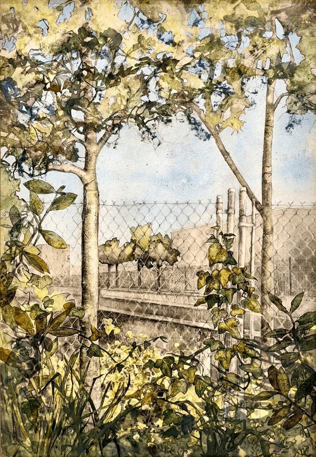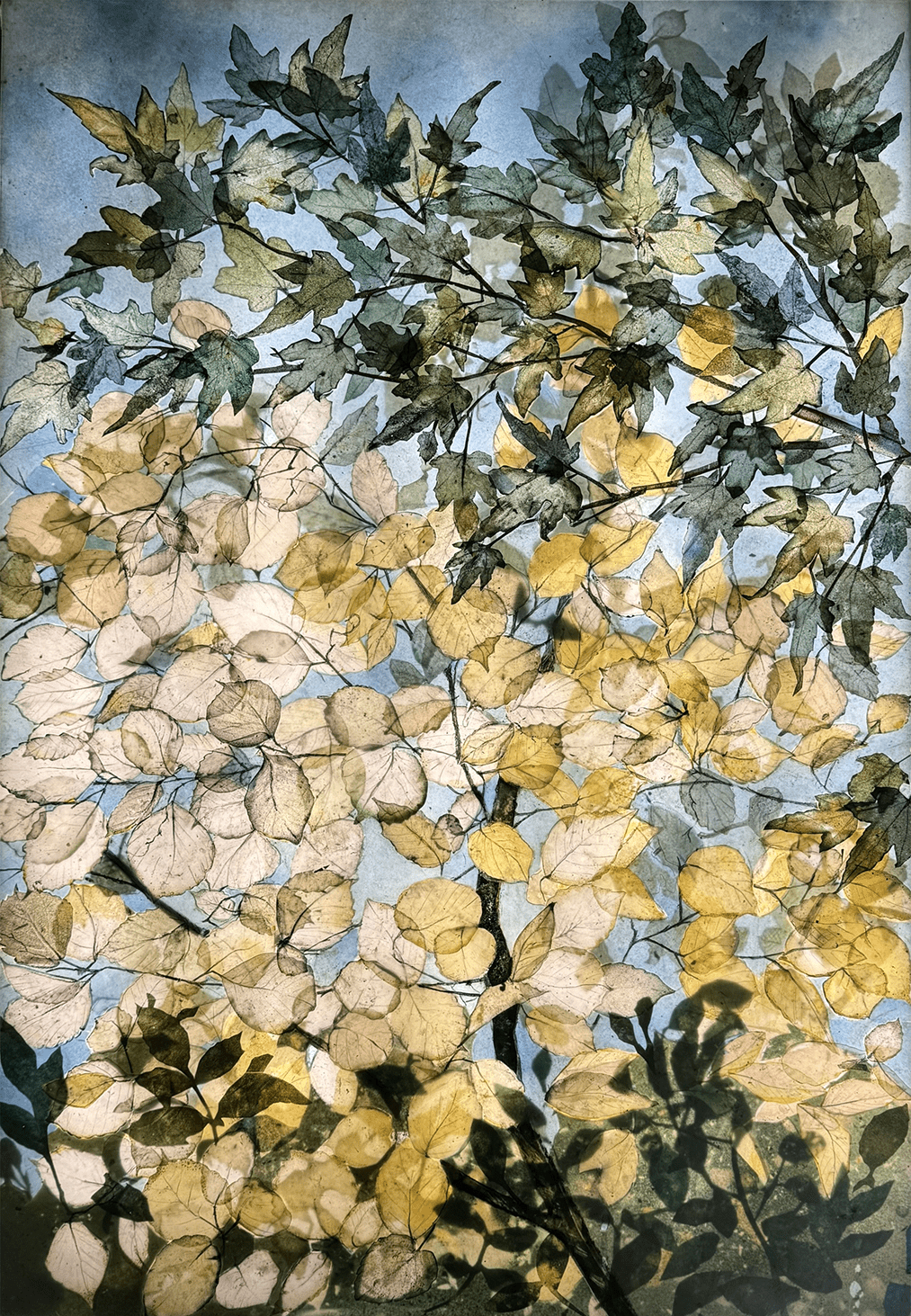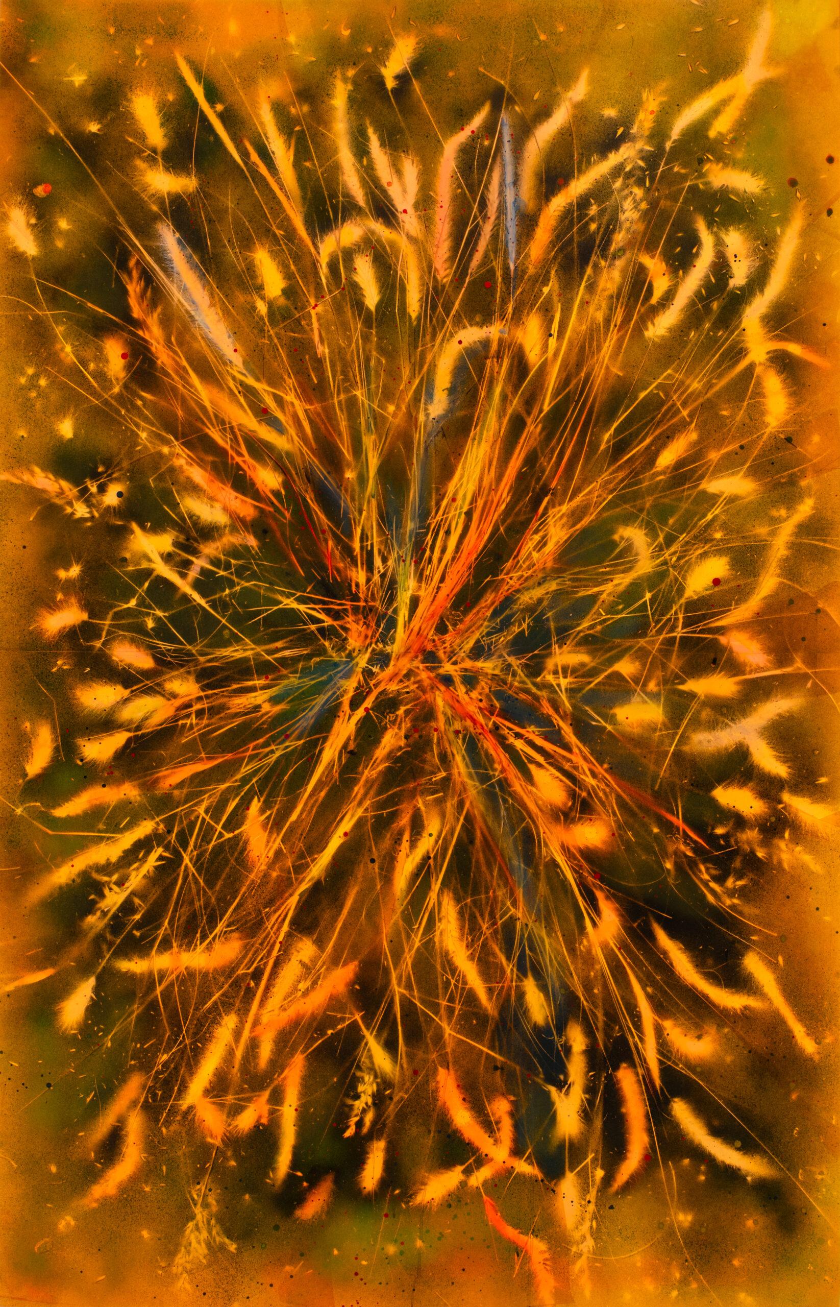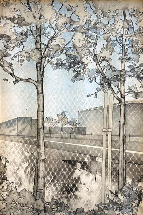 34.5 x 29 x 3 inches | Spray paint, ink and tissue paper on layered vellum set in acrylic lightbox