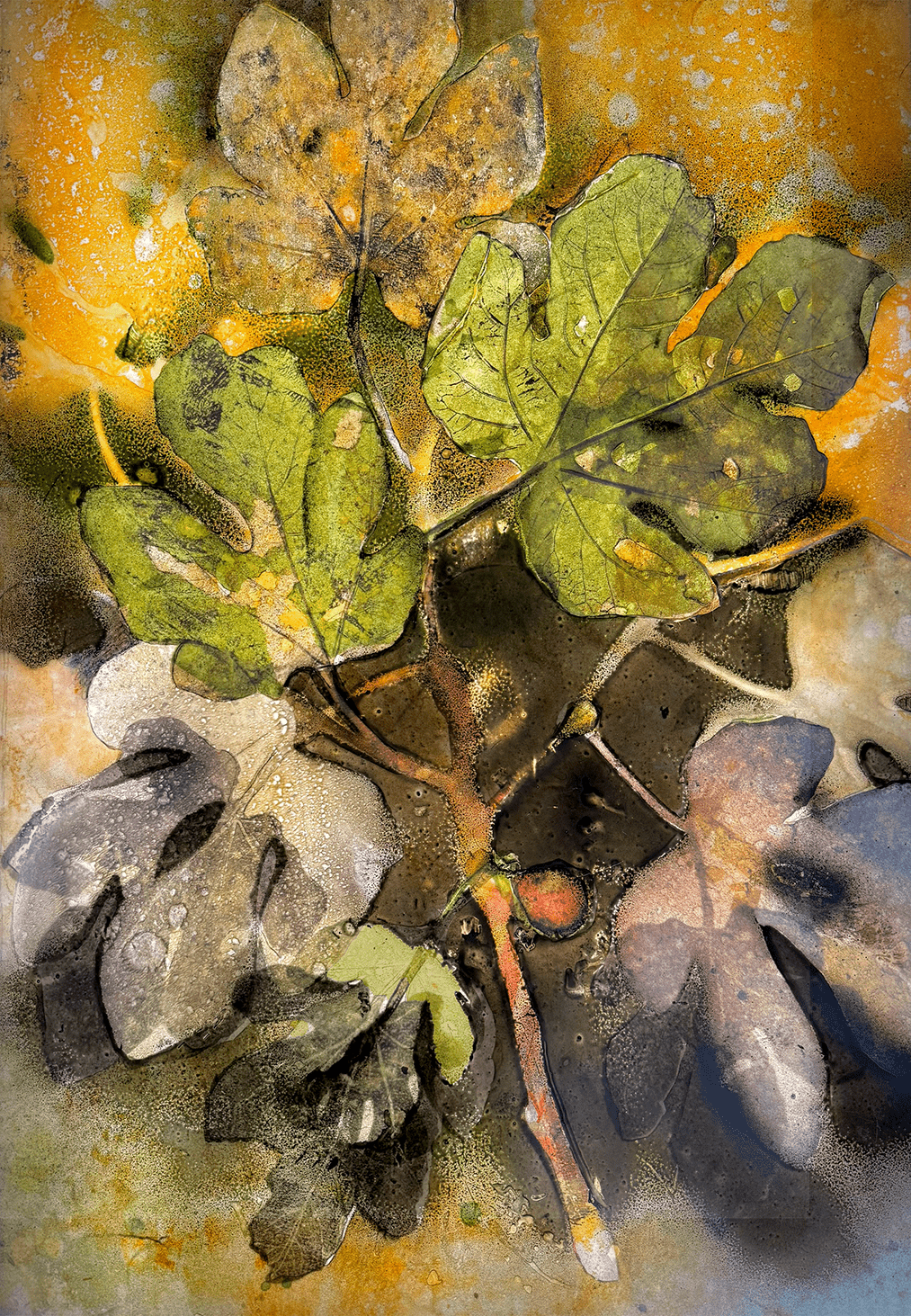 39 x 27 x 4 inches | Spray paint, acrylic, graphite, ink & chickweed on layered vellum, set in acrylic lightbox