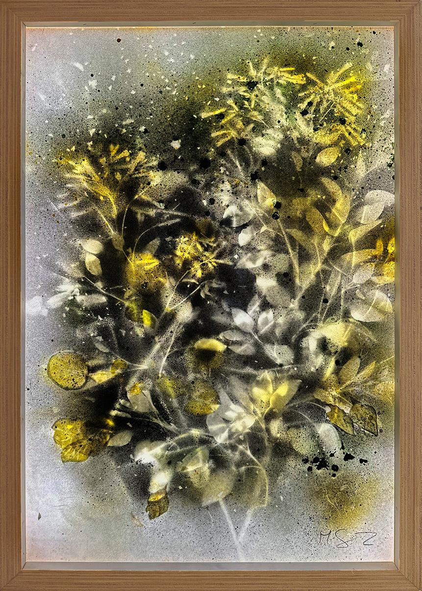 SECRET GARDEN | 38 x 25.5 x 3.5 inches | spray paint, acrylic & ink on layered vellum, set in acrylic lightbox
