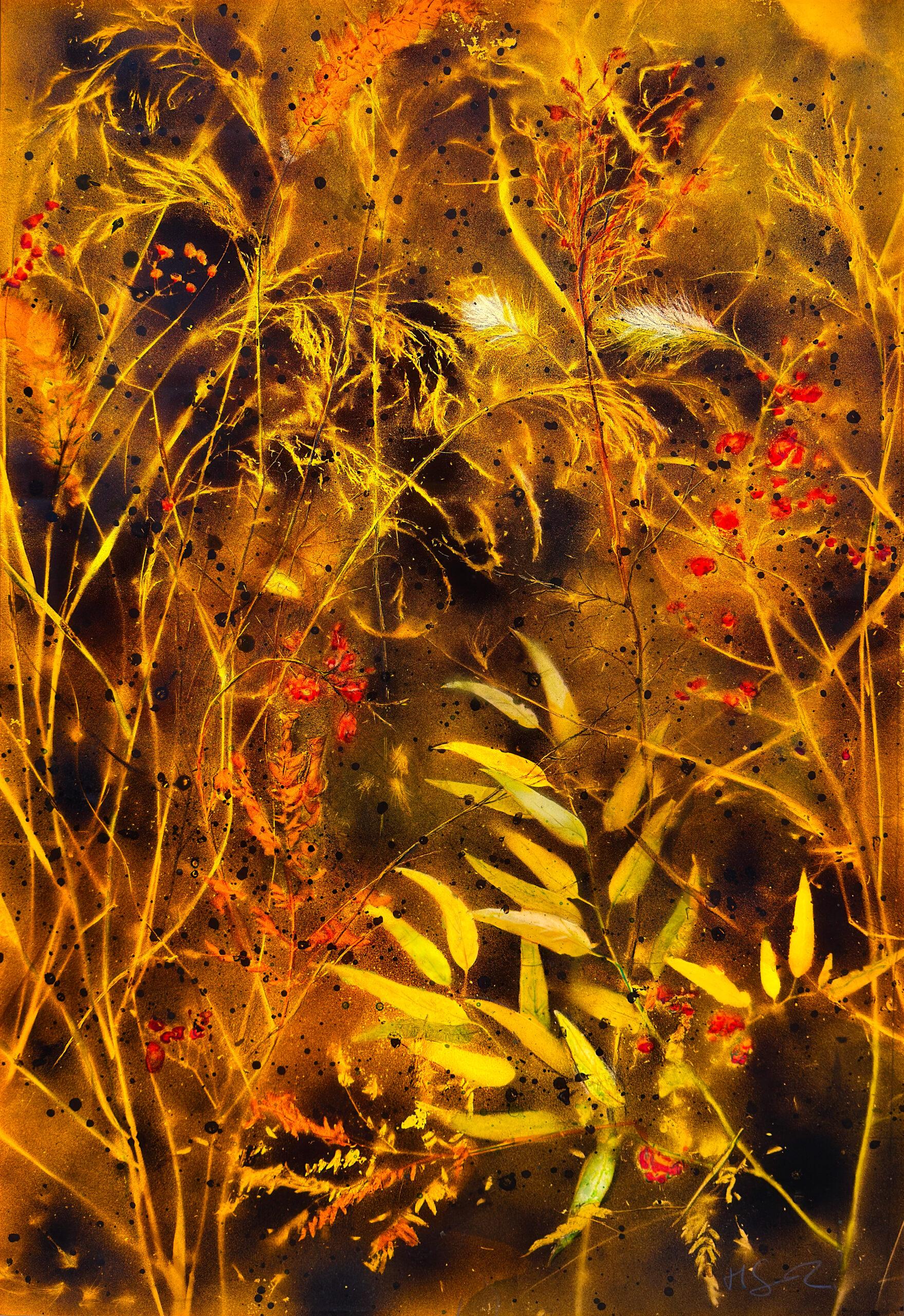 17.5 x 14.5 x 3 inches | Spray Paint, ink, layered tissue paper and vellum set in acrylic lightbox