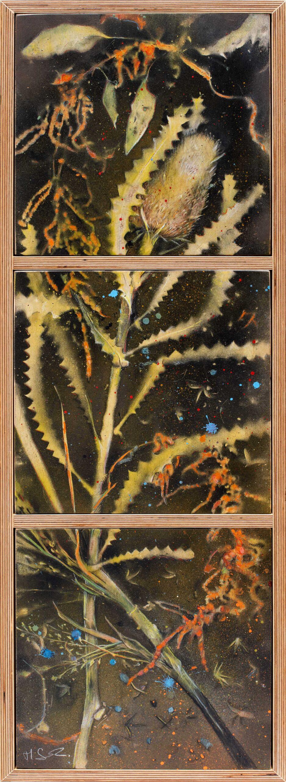 Trees and forests, along with accompanying flora, are a key motif and a prevalent theme in my work. Ever since my childhood in rural England, I have observed how the tree’s modulating shape is the principal player in forming the character and ambiance of the landscape. No matter how massive, a tree is still sadly fragile and cruelly vulnerable to the forces of change. We are made increasingly aware of the indispensability of forests in maintaining the health of our planet. I observe how the bark, or skin of a tree, complete with the textural imperfections wrought by age and decay bear testimony to the health of the whole.